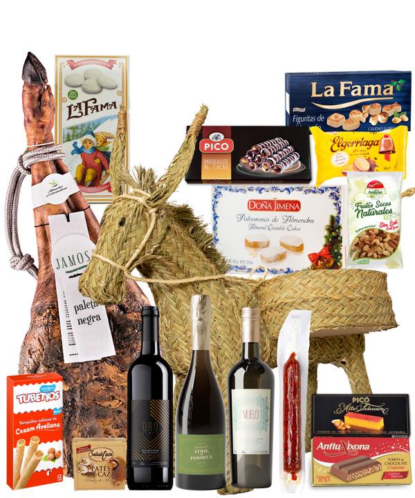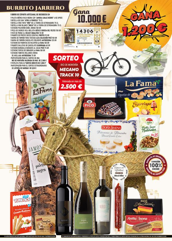 1 PALETA IBÉRICA RAZA NEGRA S/N “JAMOSA LINAJE NEGRO” 4 KG APROX 1 BOTELLA DE CAVA “ATRIL & FONSECA” 75 CL 1 BOTELLA VINO TINTO “ORO” DE LA TIERRA DE EXTREMADURA 75 CL 1 BOTELLA VINO BLANCO “VUELO” DE LA TIERRA DE EXTREMADURA 75 CL 1 ESTUCHE POLVORÓN DOÑA JIMENA 100 GR 1 PIEZA DE CHORIZO VELA BELLOTA IBÉRICO DEHESA DEL YELTES 150 GR 1 PATÉ DE PERDIZ AL BRANDY INDALITOS 70 GR 1 PAQUETE DE FRUTOS SECOS COCKTAIL FRUYPIS 93 GR 1 BARRA DE TURRÓN YEMA TOSTADA ALTA SELECCIÓN PICÓ 150 GR 1 BARRA DE TURRÓN CHOCOLATE CRUJIENTE ANTIUXIXONA 125 GR 1 ESTUCHE DE FIGURITAS DE MAZAPÁN LA FAMA 100 GR 1 PAQUETE GALLETAS DE CHOCOLATE ELGORRIAGA 60 GR 1 ESTUCHE BARQUILLO BAÑADOS AL CACAO PICÓ 75 GR 1 ESTUCHE TORTAS DE OBRADOR LA FAMA 100 GR 1 ESTUCHE TUBETOS RELLENOS CREMA DE AVELLANA ANTIUXIXONA 75 GR 1 PARTICIPACIÓN PARA EL SORTEO DE UNA BICI DE MONTAÑA VALORADA EN MAS DE 2.500 € 1 PAPELETA PARA EL”SORTEO DIRECTO DE 1.200 €” 1 PARTICIPACIÓN PARA EL SORTEO EXTRAORDINARIO DE LOTERÍA DE NAVIDAD DE 0,50 €