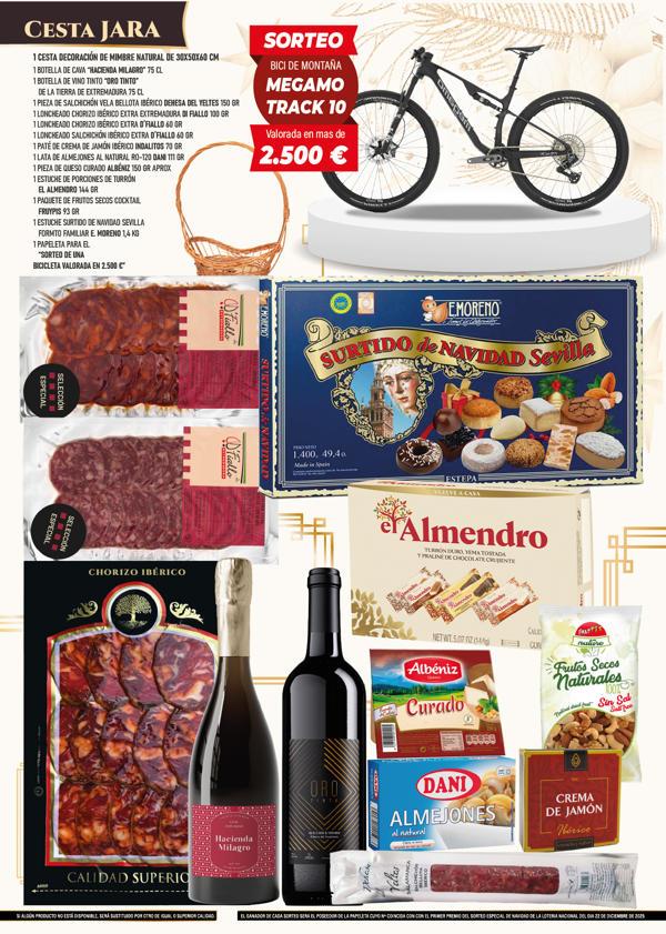 1 BOTELLA DE CAVA “HACIENDA MILAGRO” 75 CL 1 BOTELLA DE VINO TINTO “ORO TINTO” DE LA TIERRA DE EXTREMADURA 75 CL 1 PIEZA DE SALCHICHÓN VELA BELLOTA IBÉRICO DEHESA DEL YELTES 150 GR 1 LONCHEADO CHORIZO IBÉRICO EXTRA EXTREMADURA D'FIALLO 100 GR 1 LONCHEADO CHORIZO IBÉRICO EXTRA D'FIALLO 60 GR 1 LONCHEADO SALCHICHÓN IBÉRICO EXTRA D´FIALLO 60 GR 1 PATÉ DE CREMA DE JAMÓN IBÉRICO INDALITOS 70 GR 1 LATA DE ALMEJONES AL NATURAL RO-120 DANI 111 GR 1 PIEZA DE QUESO CURADO ALBÉNIZ 150 GR APROX 1 ESTUCHE DE PORCIONES DE TURRÓN EL ALMENDRO 144 GR 1 PAQUETE DE FRUTOS SECOS COCKTAILFRUYPIS 93 GR 1 ESTUCHE SURTIDO DE NAVIDAD SEVILLA FORMTO FAMILIAR E. MORENO 1,4 KG 1 PAPELETA PARA EL “SORTEO DE UNA BICICLETA VALORADA EN 2.500 €”