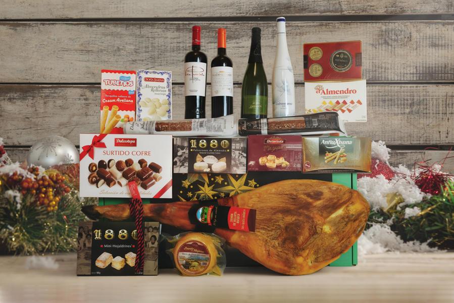 1 JAMÓN DE BELLOTA IBÉRICO 50% RAZA IBÉRICO EL COTO DE GALÁN 7/8 KG APROX 1 PIEZA DE CHORIZO VELA IBÉRICO DE BELLOTA DEHESA DEL YELTES 400 GR APROX 1 PIEZA DE SALCHICHÓN VELA IBÉRICO DE BELLOTA DEHESA DEL YELTES 400 GR APROX 1 BOTELLA DE CAVA BRUT NATURE HACIENDA MILAGRO 70 CL 1 BOTELLA DE VINO TINTO VIÑA PUEBLA 70 CL 1 BOTELLA DE VINO TINTO PALACIO QUEMADO 70 CL 1 BOTELLA DE VINO BLANCO ENTREMARES 70 CL 1 PIEZA DE QUESO DE LA SERENA FUENTE DEL MEJARAL 500 GR APROX 1 ESTUCHE FIGURITAS DE MAZAPÁN DELAVIUDA 100 GR 1 ESTUCHE POLVORÓN 1880 100 GR 1 ESTUCHE DE TUBETOS BARQUILLOS RELLENOS DE CREMA AVELLANA ANTIUXIXONA 75 GR 1 ESTUCHE DE ALMENDRAS RELLENAS DOÑA JIMENA 80 GR 1 ESTUCHE DE MINIHOJALDRES 1880 100 GR 1 ESTUCHE DE BARQUILLOS RELLENOS DE CREMA DE TURRÓN ANTIUXIXONA 75 GR 1 ESTUCHE DE PORCIONES DE TURRÓN EL ALMENDRO 144 GR 1 ESTUCHE COFRE SURTIDO CHOCOLATES DULCESTEPA 150 GR 1 DÚO PATÉ SELECCIÓN ESENCIA Y SABOR 90 GR